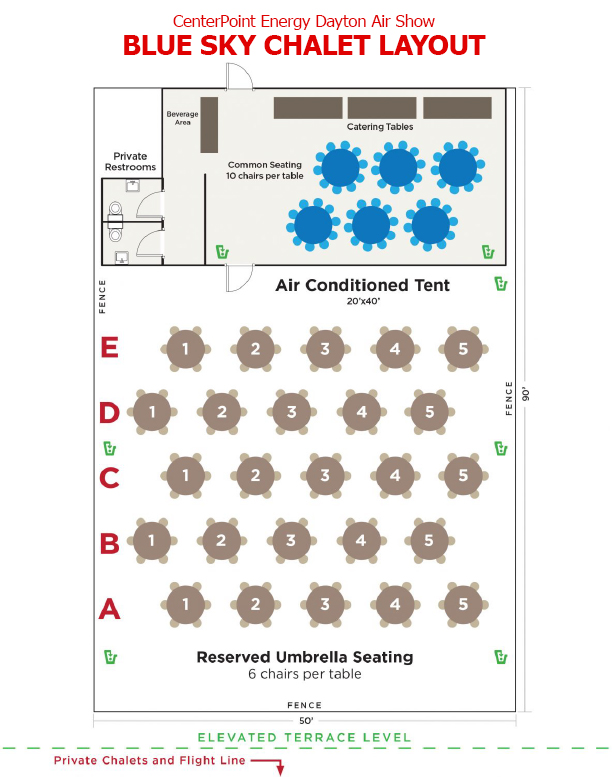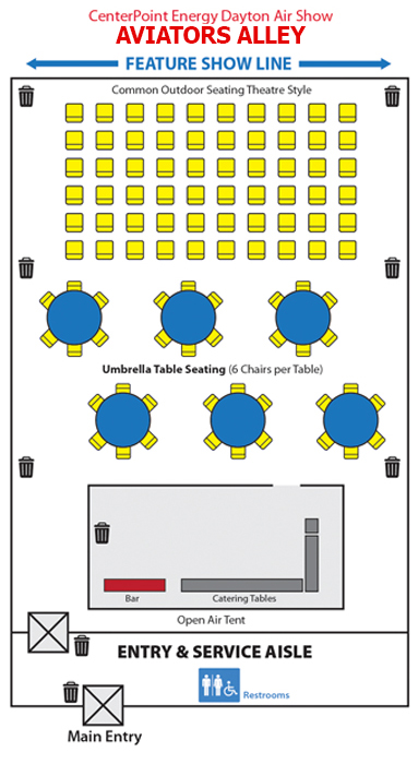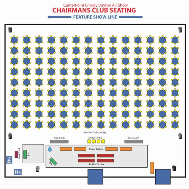 The Chairman’s Club is an exclusive area on the flight line affording members excellent viewing of the CenterPoint Energy Dayton Air Show. Amenities include a delicious buffet and full service bar in a beautifully landscaped setting. The Chairman’s Club is ideal for entertaining your clients, friends, family or special guests in first-class style.