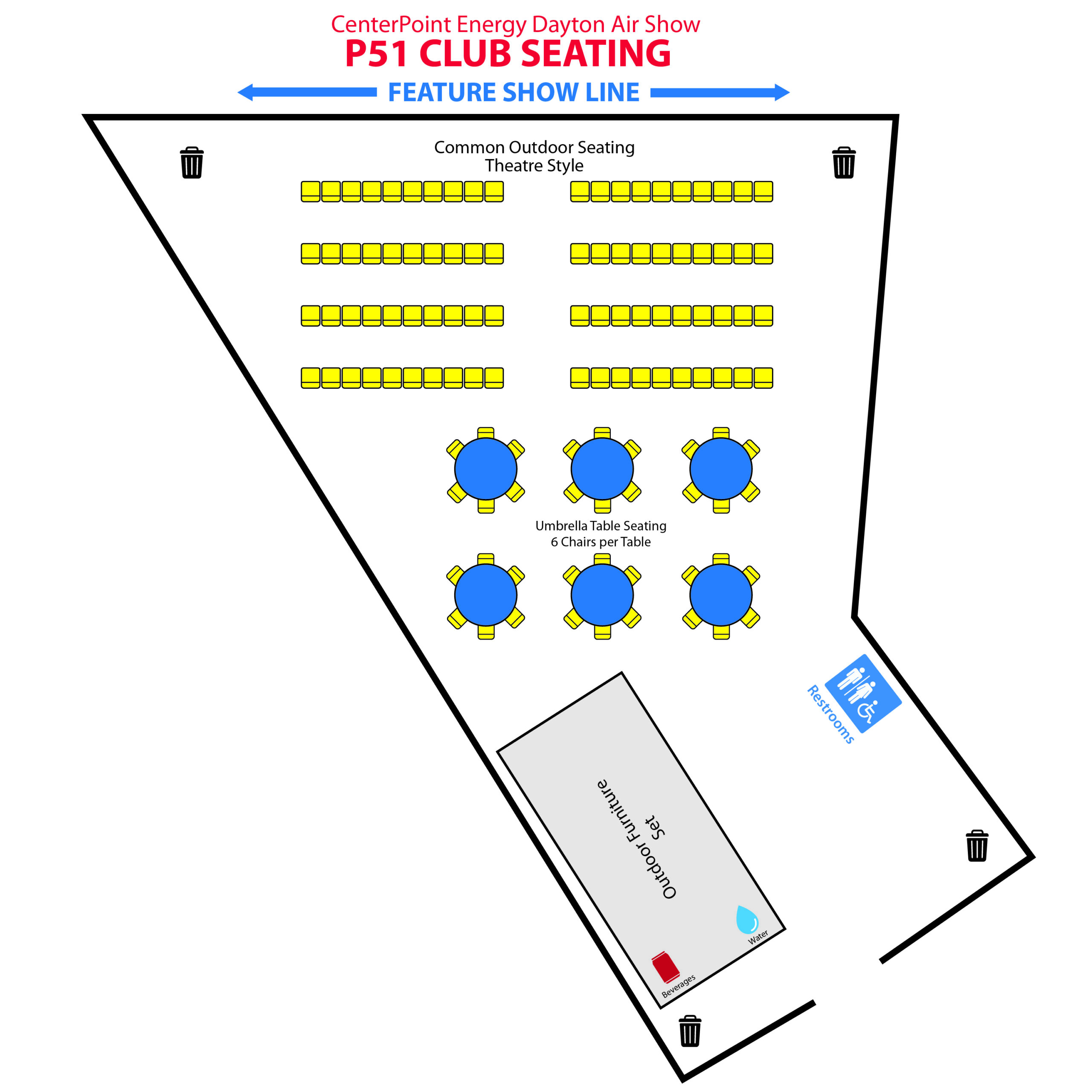 The P-51 CLUB is a spacious, tented area located right on the show line near the jet team parking designed for guests to enjoy shade and have access to tables and chairs for relaxation.