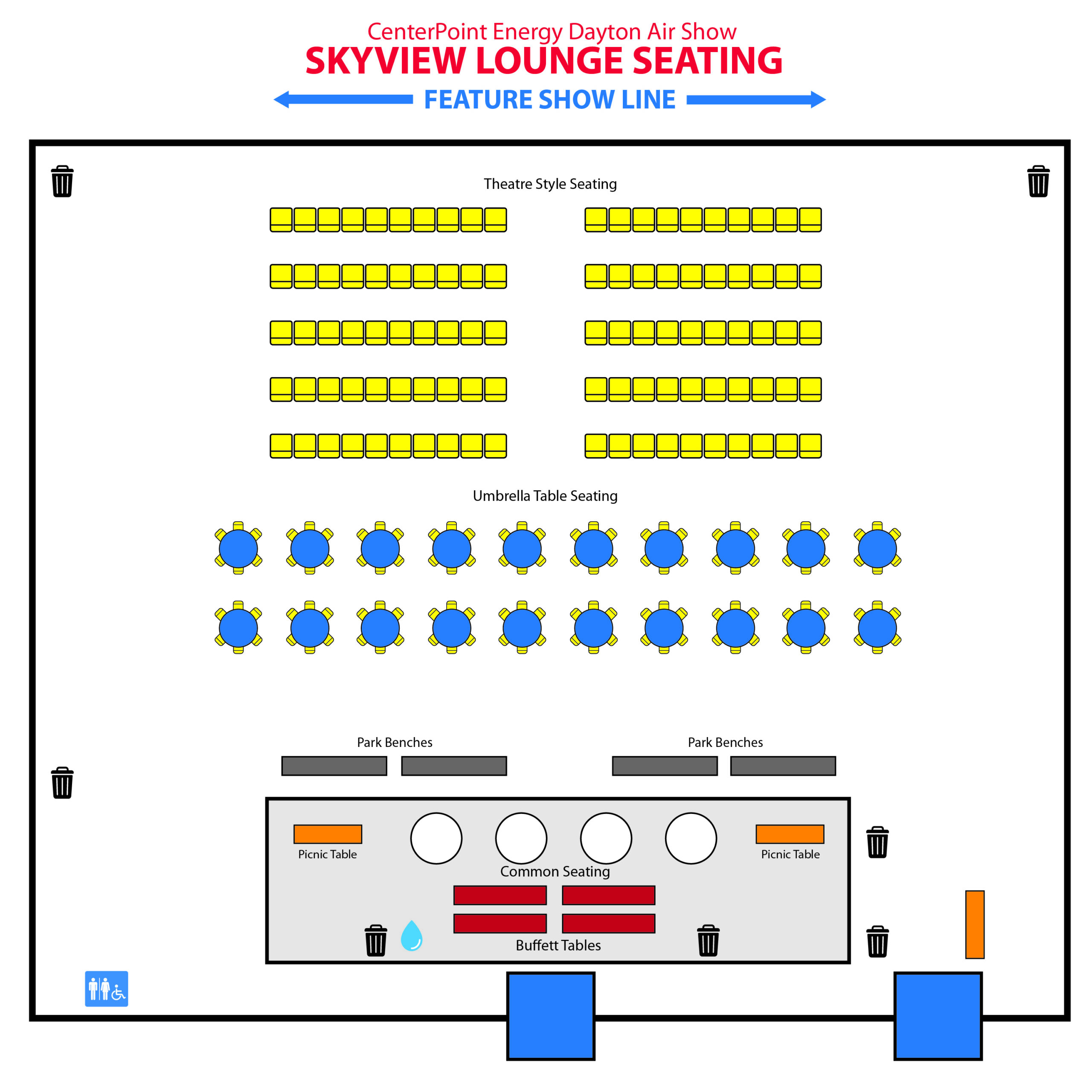 The Skyview Lounge is open theater style, non-reserved seating with access to VIP trailer restrooms and an air conditioned tent. The area is located adjacent to the Pavilion, right of show center.